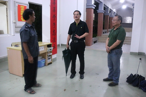 当晚21:30,在吴泱的陪同下,邱伟杰等部分在家领导先后深入映雪学生宿舍园区、囊萤学生宿舍园区,听取公环物业部经理黄进来关于采取临时闭园措施后的施行效果汇报,向始终有礼有节、耐心规劝执意出园学生放弃外出念头的安防员表示赞赏与感谢。22:00,吴泱依次前往敬贤教师公寓住宅区物管服务处、水电维修部值班室、公环物业部办公室详细了解防汛抗台人员值守情况与具体工作措施,亲切看望当班留守人员。22:30,吴泱应约携学生公寓与环境服务中心、漳州校区服务办公室副主任刘宜辉以及漳州校区服务办抢险应急队队长黄进来、林帆共同参加由厦门大学校长助理、漳州校区党工委书记、管委会主任、嘉庚学院党委书记邱伟杰主持召开,嘉庚学院部分在家领导、嘉庚学院各部门负责人共同列席的漳州校区防台登陆紧急动员会。会上,邱伟杰首先依次传达了厦门大学党委书记张彦,厦门大学校长朱崇实,厦门大学党委副书记、防台防汛领导小组组长林东伟对本次漳州校区防汛抗台工作的指示要求,向在座各部门负责人发出“不死人、少损失”的最后动员令。随后,在共同就超强台风“莫兰蒂”登陆趋向及可能给漳州校区带来的影响进行了分析研判的同时,与会各部门负责人还就本部门防汛抗台工作部署与落实情况进行了综述汇报。为最大限度降低超强台风“莫兰蒂”登陆对漳州校区所造成的灾难性影响,邱伟杰特别要求漳州校区服务办各部门必须着眼假设极端状况发生的可能,并立足相应科学预判,在确保员工队伍人身安全的前提下,有的放矢地做好学生宿舍园区临时闭园禁足措施实行,停水断电应急抢修,教师公寓住宅区楼栋门窗锁闭、高空坠物巡查,供餐用水储备及馒头、花卷、面条等快熟手工食品连夜赶制工作。