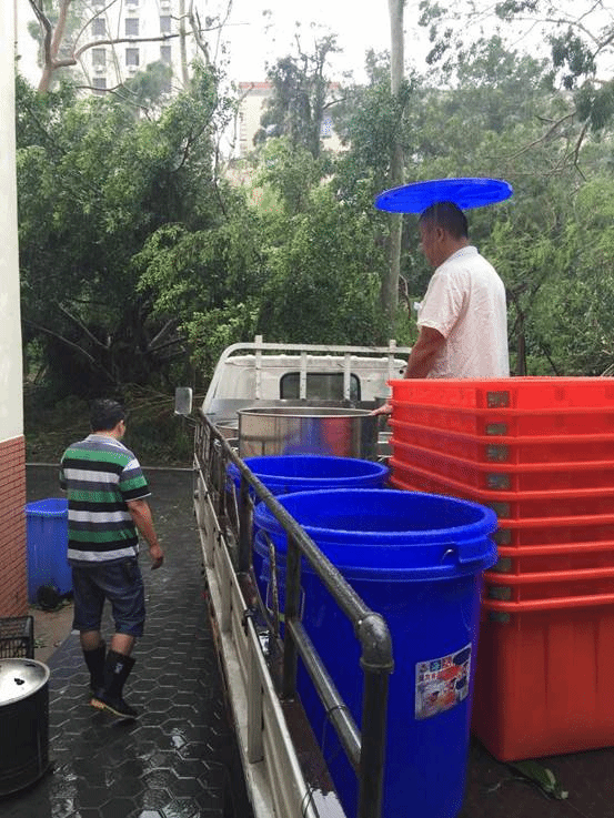 齐心互助渡难关——停电,餐厅用发电机发电;没水,餐厅互助取水。受台风正面袭击,翔安校区在台风过境后就开始停电,并据说“很有可能持续到傍晚”,竞丰餐厅、丰庭餐厅经理15日一大早即前往附近村落寻找柴油,中午,油罐车及时抵达,发电机得以持续工作。16日凌晨,校本部餐厅陆续到水,但海韵学生公寓的水压直到早晨6点还不够,二期餐厅员工开着工具车前往南光餐厅取水,正赶上倾盆大雨,尽管浑身湿透仍在雨中装好满车水。