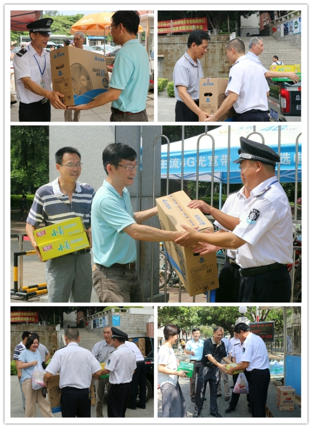 七月如火的骄阳带来的持续高温对户外作业人员构成了严峻的挑战。7月15日上午,校工会常务副主席宋毅、副主席史虞龙、副主席秦红梅,集团党委书记叶鹏飞、副总经理陈有亮、党委副书记邓泽君、部门工会主席沈雄晖等先后走访慰问了在芙蓉隧道、海韵新岗、海韵公寓大门、海韵园门岗、东区校门、海滨校门、白城校门、上弦场门岗、西校门、大南校门、西山门岗11处校门安防门岗的上班队员,并送去煮中药凉茶器皿、风扇、菊花茶、绿豆、中药凉茶等防暑降温慰问品。