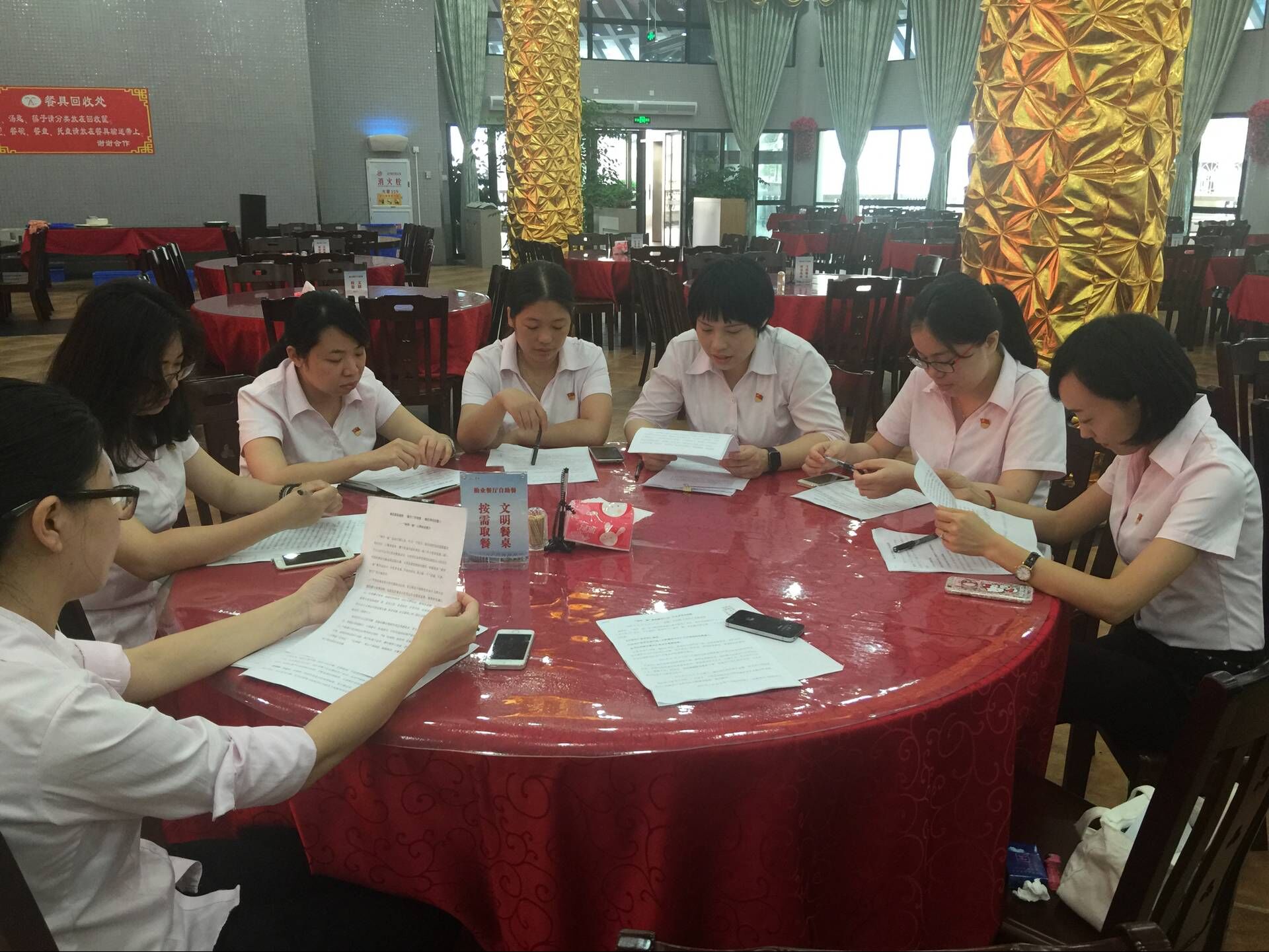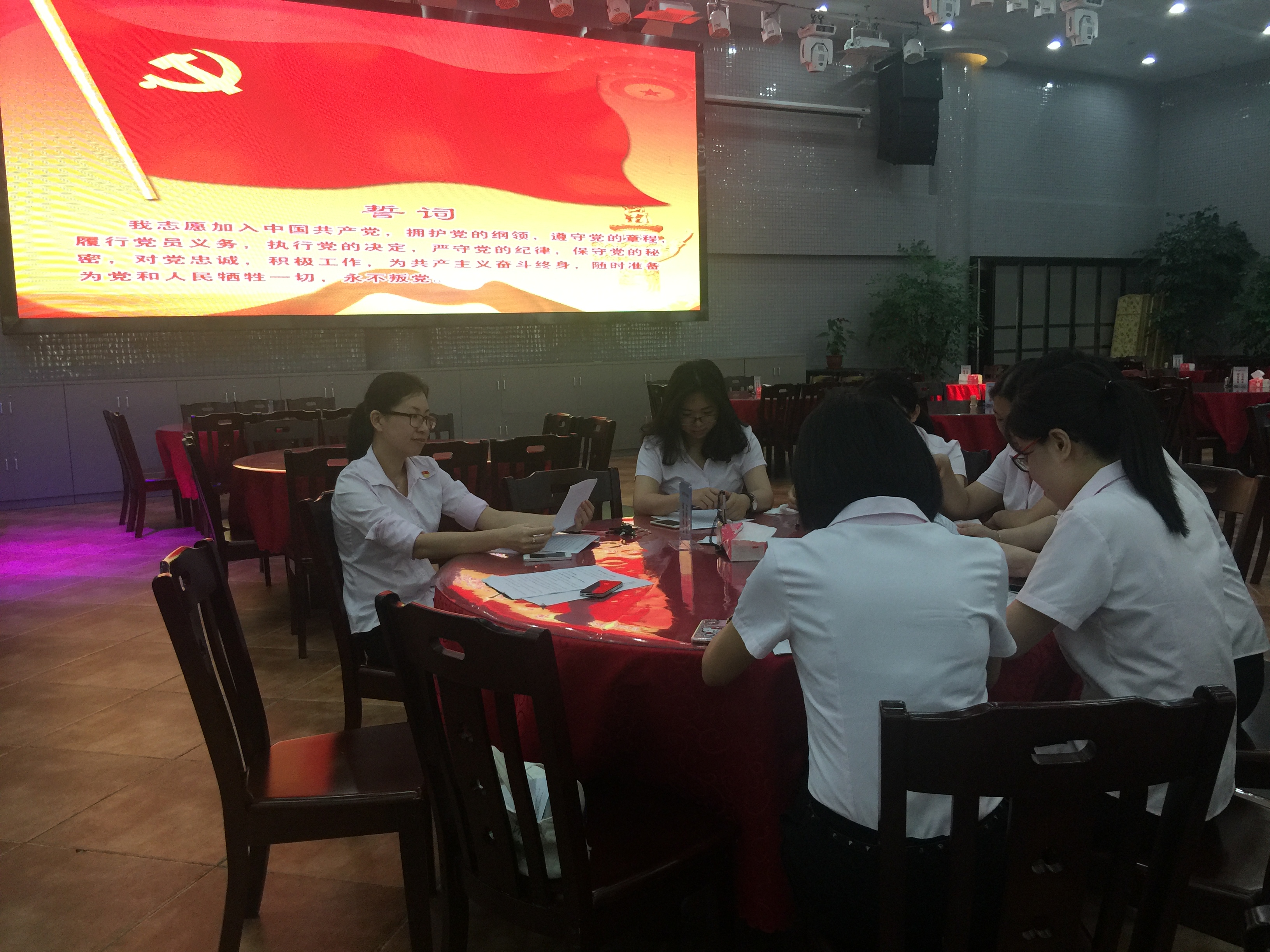 5月24日上午9:00,勤业餐厅三楼大显示屏上党旗飘飘,入党誓词神圣庄重。第二党小组在组长、南光餐厅经理陈琳琳的带领下,重温入党誓词,并集中学习了人民网上“两学一做”系列辅导第九课《什么是党员标准》。随后大家踊跃发言,开展专题讨论。