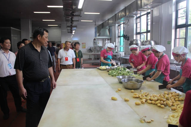 按照食品安全管理体系的流程,检查组对所有专间及通道进行了现场查看和记录,互相交流、提出意见。在调味品库、验货室,看到摆放规整的物料、粘贴清晰的标识,检查人员纷纷给予赞赏;在切菜间,正好碰上员工备料,监管人员观摩了员工择洗、去皮、切配、装盘等操作过程;在烹饪间,了解到餐厅的食品暂存措施,不少检查人员还对中心自行设计、制作的不锈钢熟食运餐车等设施表现出极大兴趣。