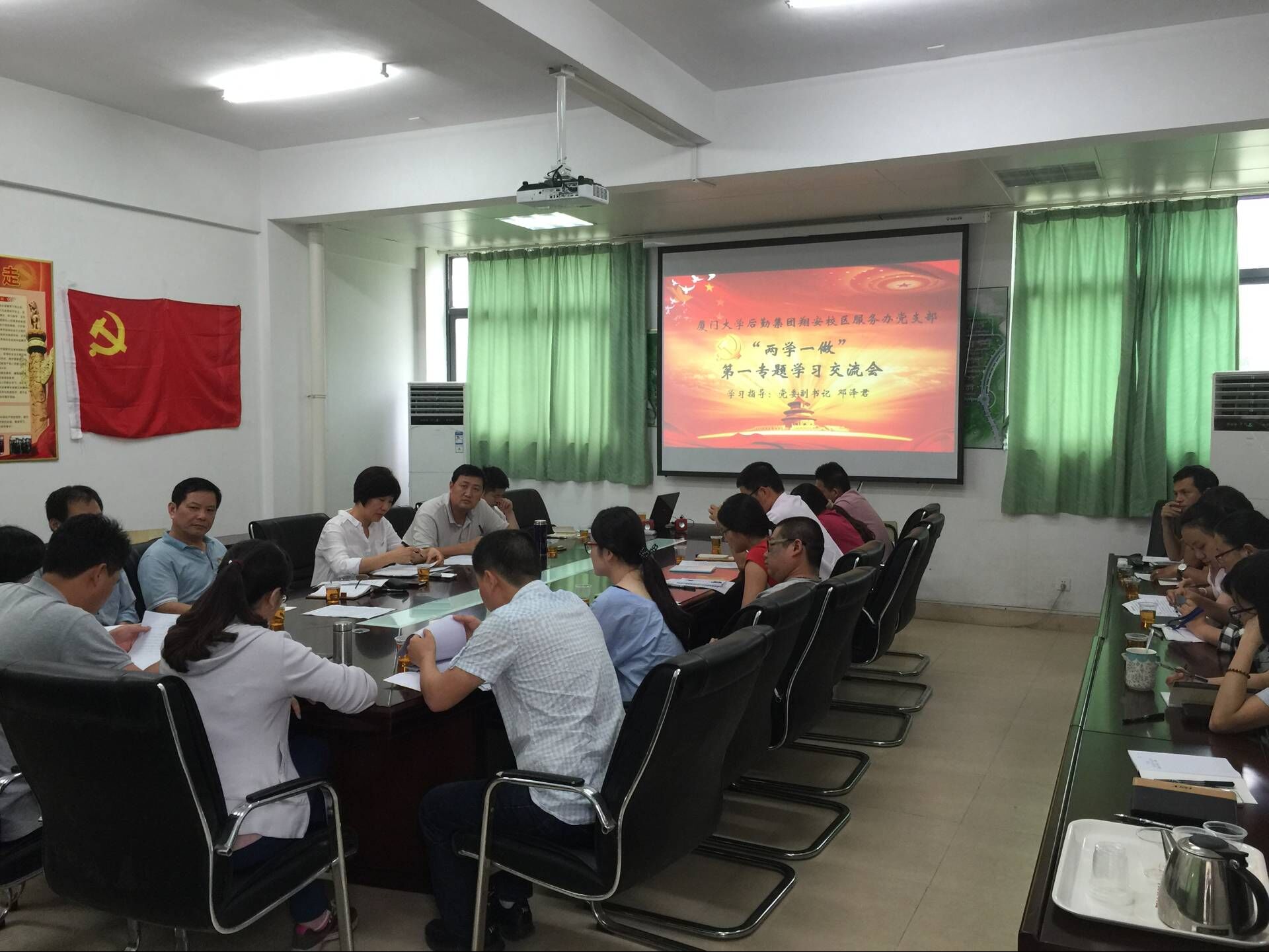 5月24日,翔安校区服务办党支部在南安1会议室召开“两学一做”第一专题学习交流会,集团党委副书记邓泽君、服务办党支部所有党员参会。会议由集团总经理助理、翔安校区服务办主任、党支部书记王裕民主持。