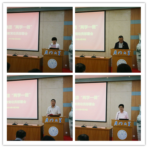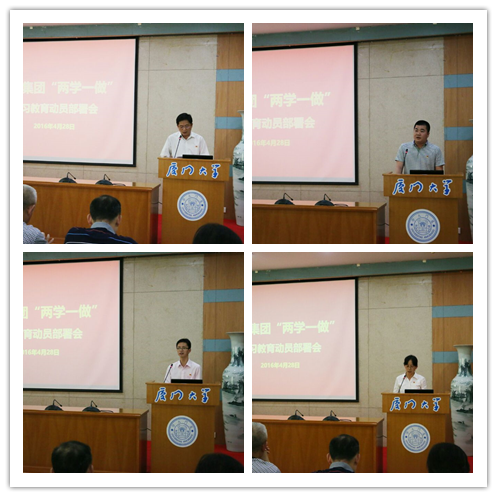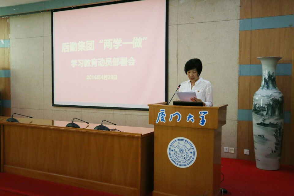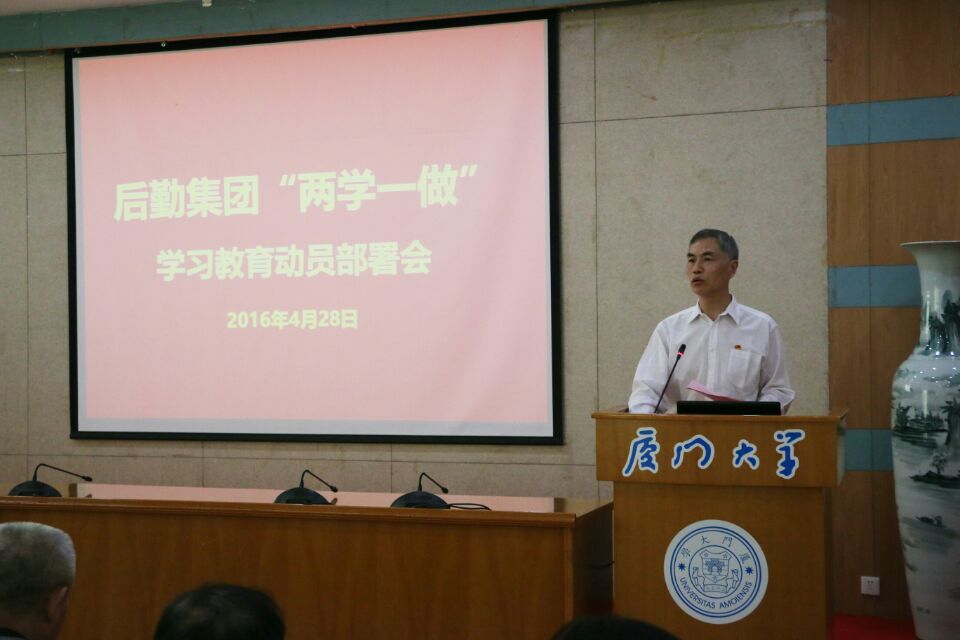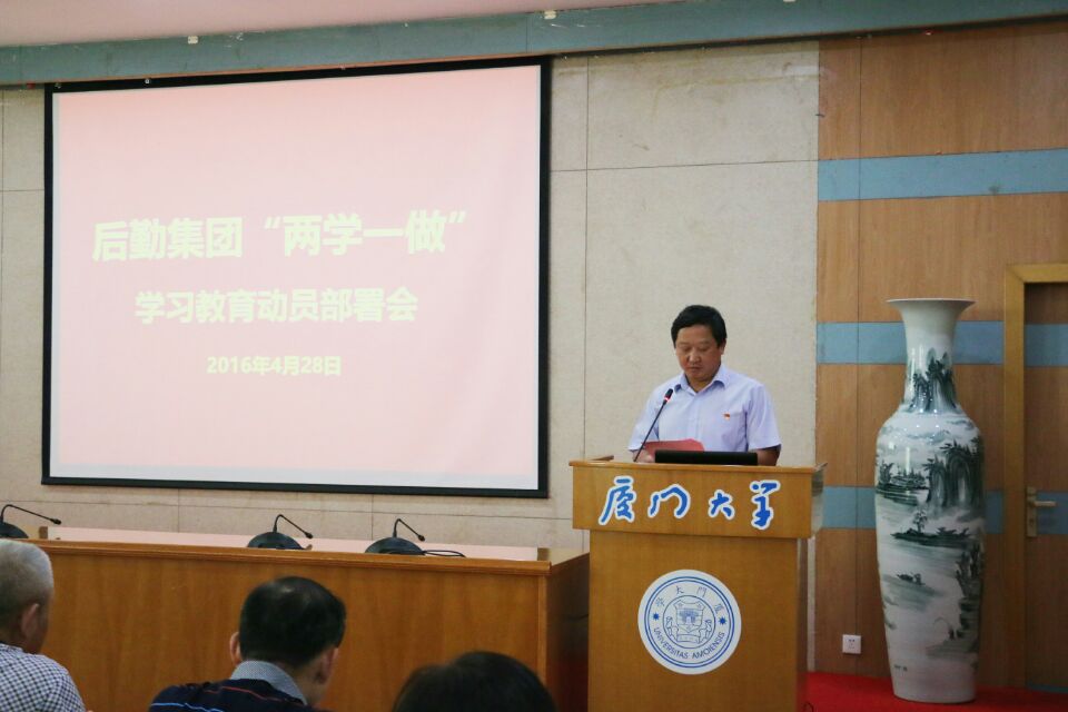 2016年4月28日下午14:30,根据《厦门大学关于在全校党员中开展“学党章党规、学系列讲话,做合格党员”学习教育实施方案》(厦大委综[2016]15号)精神和《厦门大学“两学一做”学习教育督导组工作方案》的工作安排,经过认真筹备,后勤集团在颂恩楼220会议室隆重召开了“两学一做”学习教育动员部署会。会议由总经理林公明主持,后勤集团全体党员和入党积极分子参加了会议,校“两学一做”第四督导组陈雪玲组长、梁振伟联络员莅会指导。