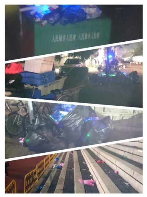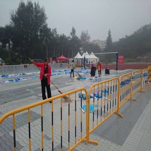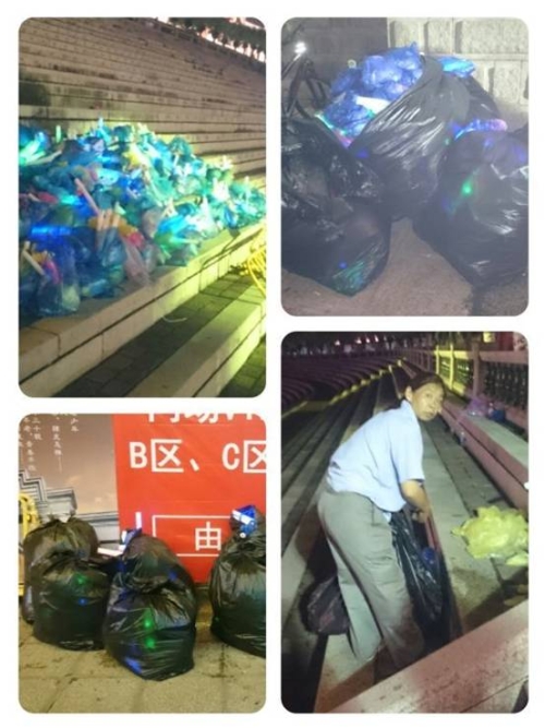 中心绿化保洁部此前已完成了上弦场两个临时车道、一个应急通道范围内的树木移植工作,并修剪了三个通道范围内5米以下的树干枝条,为会场布置扫清了障碍。5月1日当天,中心运动场馆部和绿化保洁部通力协作,安排人员共同维护场地卫生,并在上弦场分置42个百升垃圾桶。下午2点,20名保洁员入场整理场地卫生,于4点半将干净整洁的场地交付使用。晚会结束后已经是深夜11点多了,此时在场外等候清场的保洁员们开始进场清理垃圾,连夜清洁至次日凌晨3点多,总共清理垃圾100多袋。中心绿化部也在第二天及时完成了上弦场三个通道的绿化恢复工作。