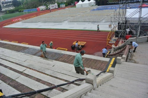 5月1日晚上,厦门大学1986级校友在上弦场举办了“再逢青春”入学30周年联欢晚会。为了确保此次晚会场地的洁净卫生,4月27日,后勤集团副总经理陈有亮、学生公寓与环境服务中心主任张金满及有关负责人针对晚会的保障工作召开了专项工作会,对上弦场临时拆墙、植物假植及各环节的场地卫生等工作进行了细致安排。