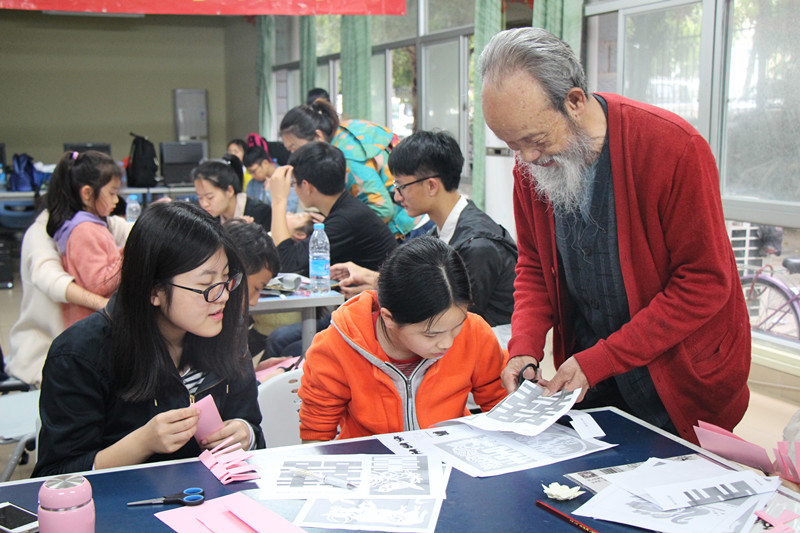 热烈的一对一辅导与互动之后,我们终于迎来了本次活动的高潮。厦门市剪纸非物质文化遗产传承人洪志标先生应邀来到活动现场,进行剪纸体验课的教学。洪志标先生一袭红衫,美髯长须加上慈爱的笑容显得特别有亲和力,在志愿者和小朋友的热烈掌声中,他登台进行剪纸演示。他手握剪刀,十分从容和淡定,轻轻松松便剪出了各种繁复的花样,剪法精炼,技艺高超,令人叹止。洪先生一边讲解,志愿者带着小朋友们拿着手工剪刀一起动手,花纹各异,精彩纷呈。