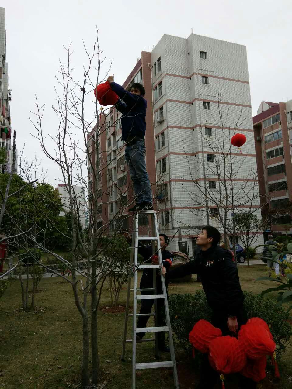 图组二:维序维修组“高高挂”,为各个主路段、次校门装点红灯笼和贺新春对联,祥和一片。