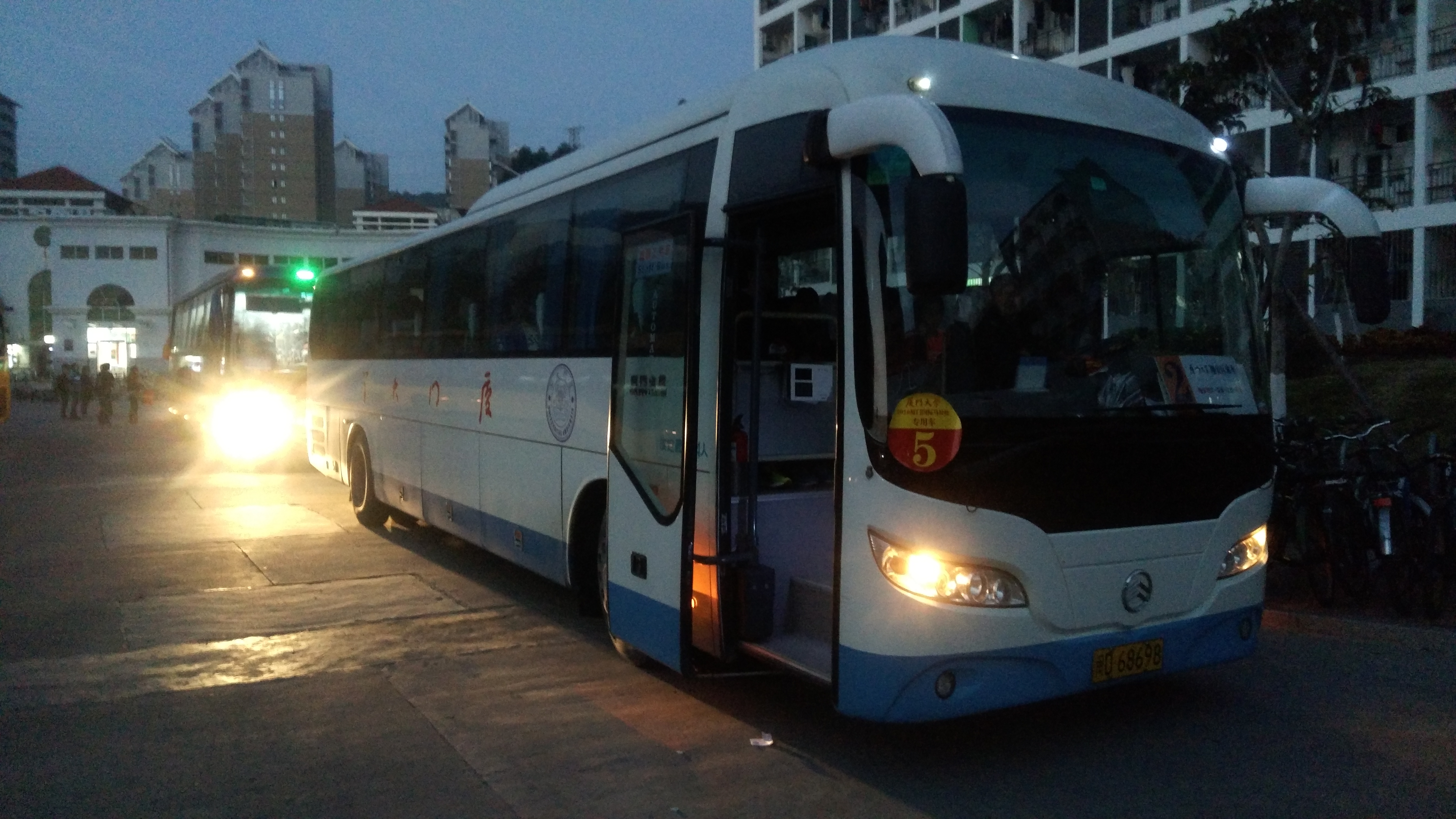 2016年1月2日上午6:15,按照前期周密制定的方案,16部车准时到达思明校区三家村、厦大学生公寓一期食堂门口以及翔安校区一期综合楼三个接送点,整齐排列,于6:30准时发车,在微朦的晨曦和带着些许凉意的晨风中将600余名厦大志愿者及运动员送往马拉松的起点。