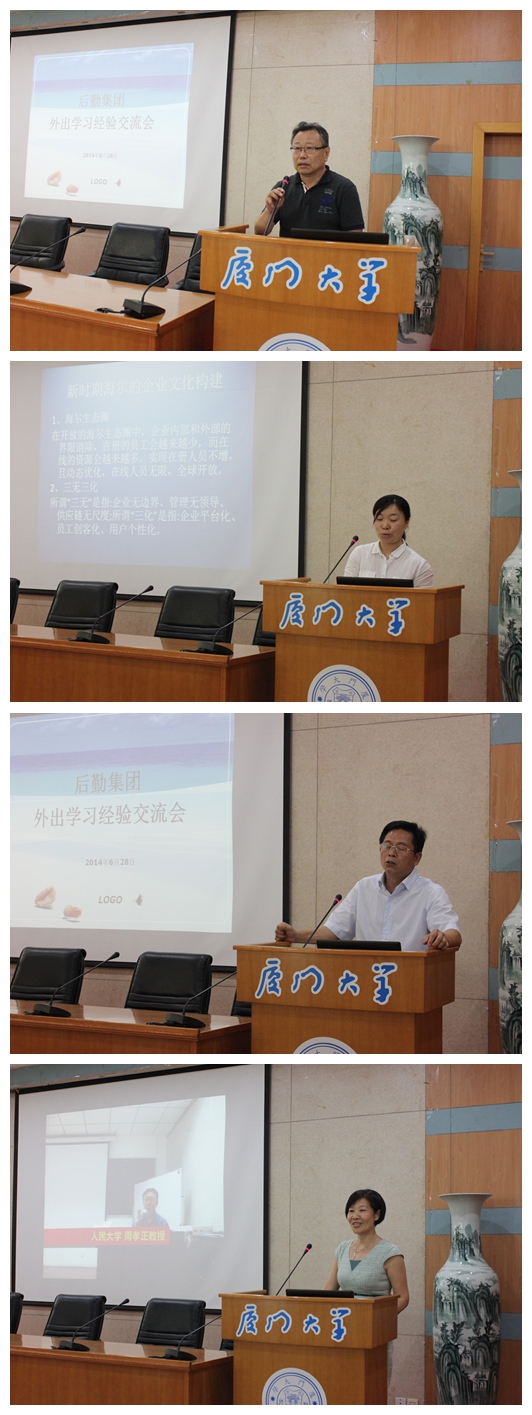 集团4名外出学习者先后上台交流。集团总经理助理、漳州校区服务办主任吴泱分享了海尔企业文化核心——“创新”,即概念创新、技术创新、市场创新、组织创新等,分享了海尔企业倒三角的组织架构、人单合一的市场开拓战略、员工创客化的激励策略等。人力资源部副经理麻燕凌补充分享了海尔企业“赛马不相马”、“斜坡球体人才发展论”等人力资源管理理念,及参加第一期全国高校后勤文化建设与人力资源管理高级研修班的学习心得。饮食服务中心副主任张金满图文并茂地分享了带队参加第二十四届中国厨师节博览会后,对饮食文化中对传统文化的融合、升华及对完美、健康美食不懈追求两大深刻体会。集团党委副书记邓泽君分享了两次外出学习培训的体会,特别挑选了网络信息传播环境中公共危机的信息管理策略及公共管理核心与前沿两门课程向与会人员作了交流。