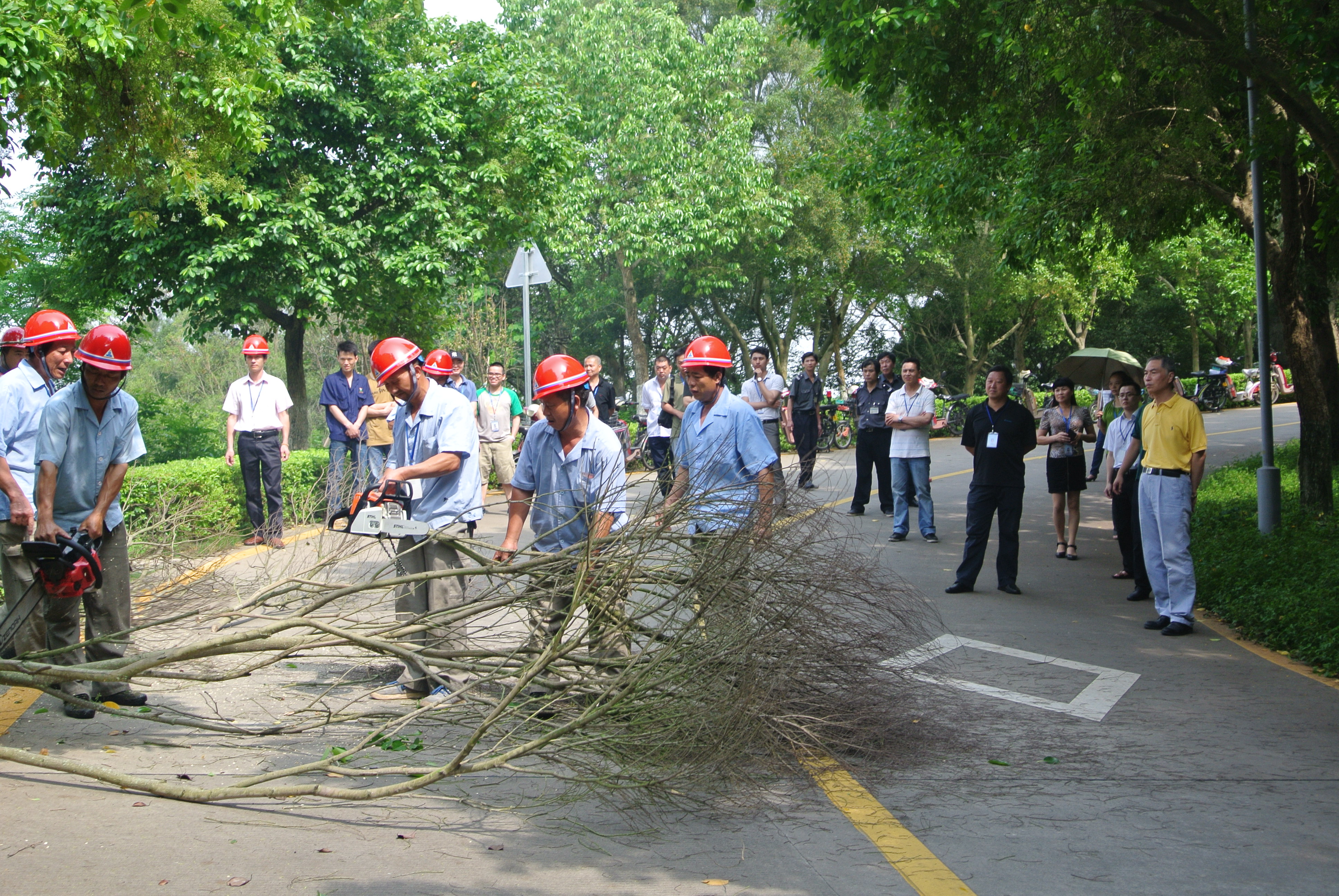 在凌云山麓,资产与后勤事务管理处事务管理科、后勤集团学生公寓与环境服务中心组织开展道路清障专项应急演练。抢险人员首先有条不紊检查各类设备,娴熟安装完毕,整装待发;到达现场后,立即设立路障,做好安全隔离措施,并专人防守,防止外人误闯现场;做好安全措施后,齐心协力锯倒已经枯死的树木,迅速将倒伏的树木用油锯进行切割,并快速利落把切割和砍伐的树枝搬上清运车辆,运离现场。整个场面紧张有序、快而不乱。