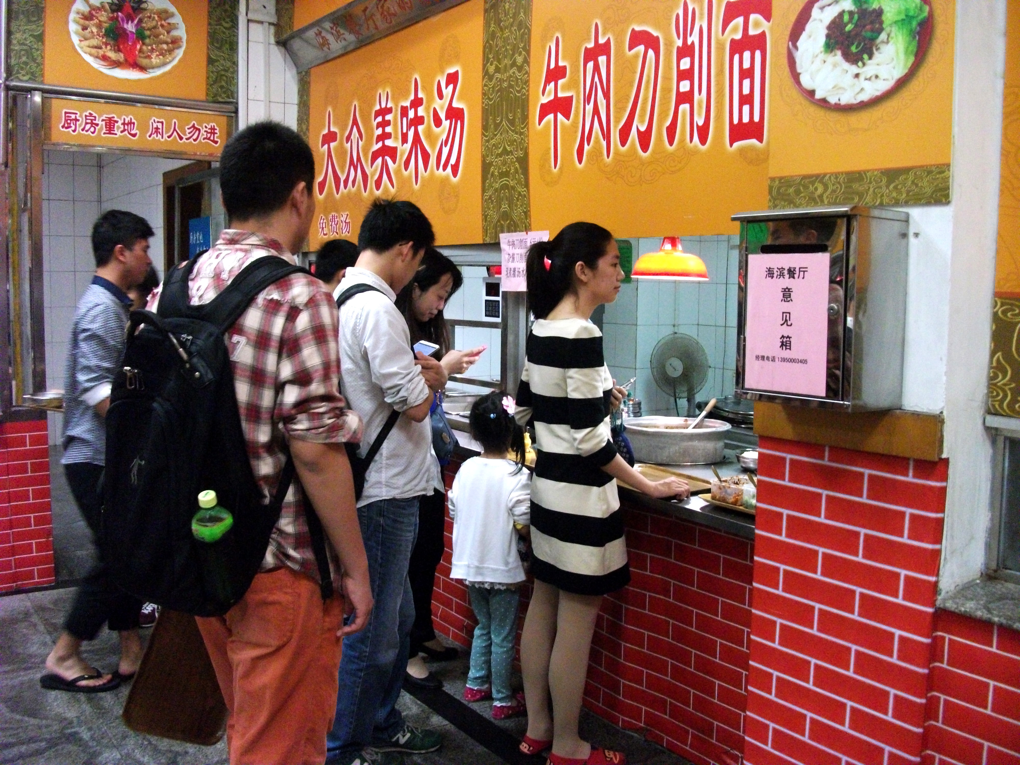 “好,好!”做面师傅憨憨地笑着,手中熟练地削着面,白花花的面片争先恐后地扑入汤锅中,不一会儿,热气腾腾的面新鲜出锅,浇上杂酱,香喷喷的刀削面大功告成。师傅从窗口里递出面,抬头看了看排在窗口前的队伍——嚯,十多个人!