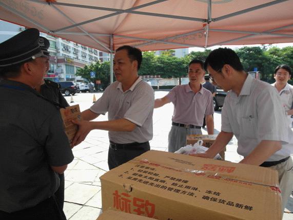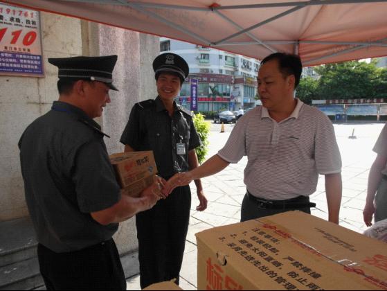 7月10日下午,集团总经理谢银辉、党总支书记叶鹏飞、副总经理曾国斌、总经理助理王裕民等一行九人分乘两辆车,满载防暑降温物资,先后走访了西校门、南校门等十个点,亲切慰问在岗奋战的安防员工,把矿泉水、菊花茶、藿香正气水、绿豆、白糖等防暑用品送到他们手中,给他们送去一份清凉。每到一处,领导们与员工亲切握手,真诚道声辛苦了,感谢他们不畏高温辛勤工作,并叮嘱一定要多补充水分,在做好本职工作的同时注意休息。