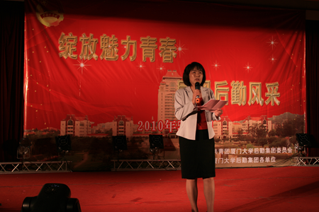 庄惠美首先代表集团领导班子致辞,对晚会的举办表示热烈祝贺,并对广大团员提出了希望。她指出,后勤集团成立七年多来,形成了一支“特别能吃苦、特别能战斗、特别能奉献”的后勤服务队伍,这当中,广大团员青年充分发挥了生力军和突击队作用,紧紧围绕学校教育事业的大局努力做好各项后勤服务保障工作,取得了令人鼓舞的业绩,赢得了广大师生的肯定。希望广大青年团员再接再厉、与时俱进、锤炼品德、勤奋学习、努力工作、甘于奉献,在今后的工作岗位中再立新功!