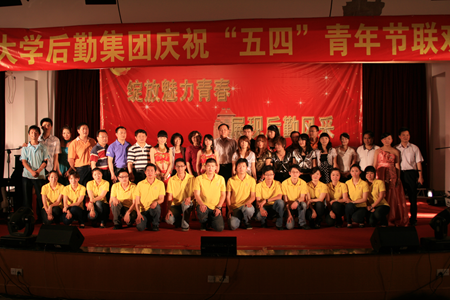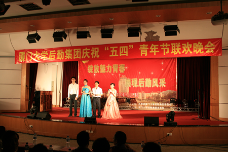 为庆祝五四运动91周年和中国共青团建团88周年,在后勤集团团委成立一周年的日子里,后勤集团“五四”青年节联欢晚会于当晚拉开帷幕。校团委副书记陈雪玲,后勤集团总经理谢银辉、党总支副书记庄惠美、副总经理郑庆喜等集团领导班子成员,集团一级岗位、二级岗位管理人员,各党支部书记,集团部门工会、妇委会、团委委员,全体团员,集团员工以及部分师生兴致勃勃地观看了演出。
