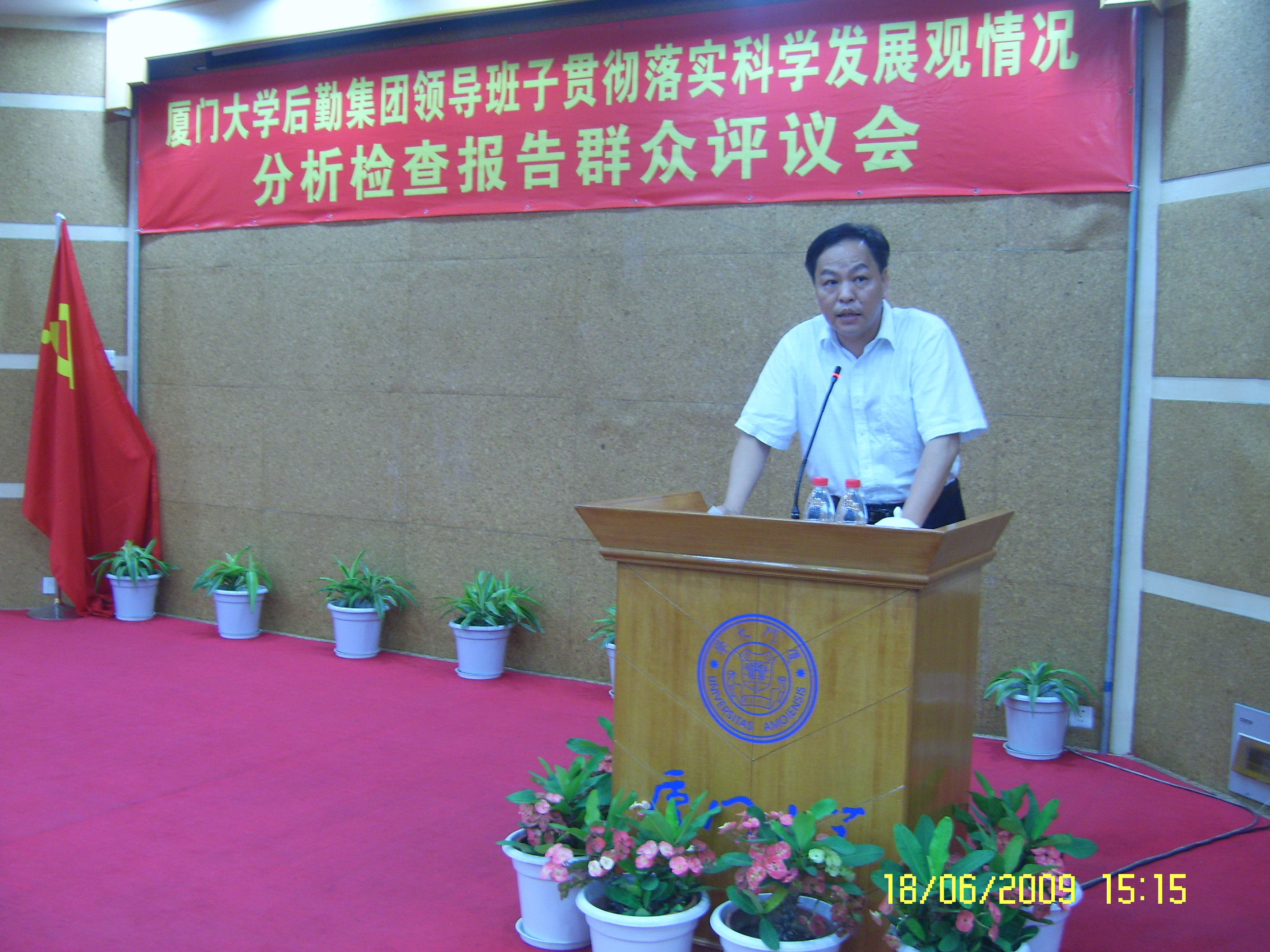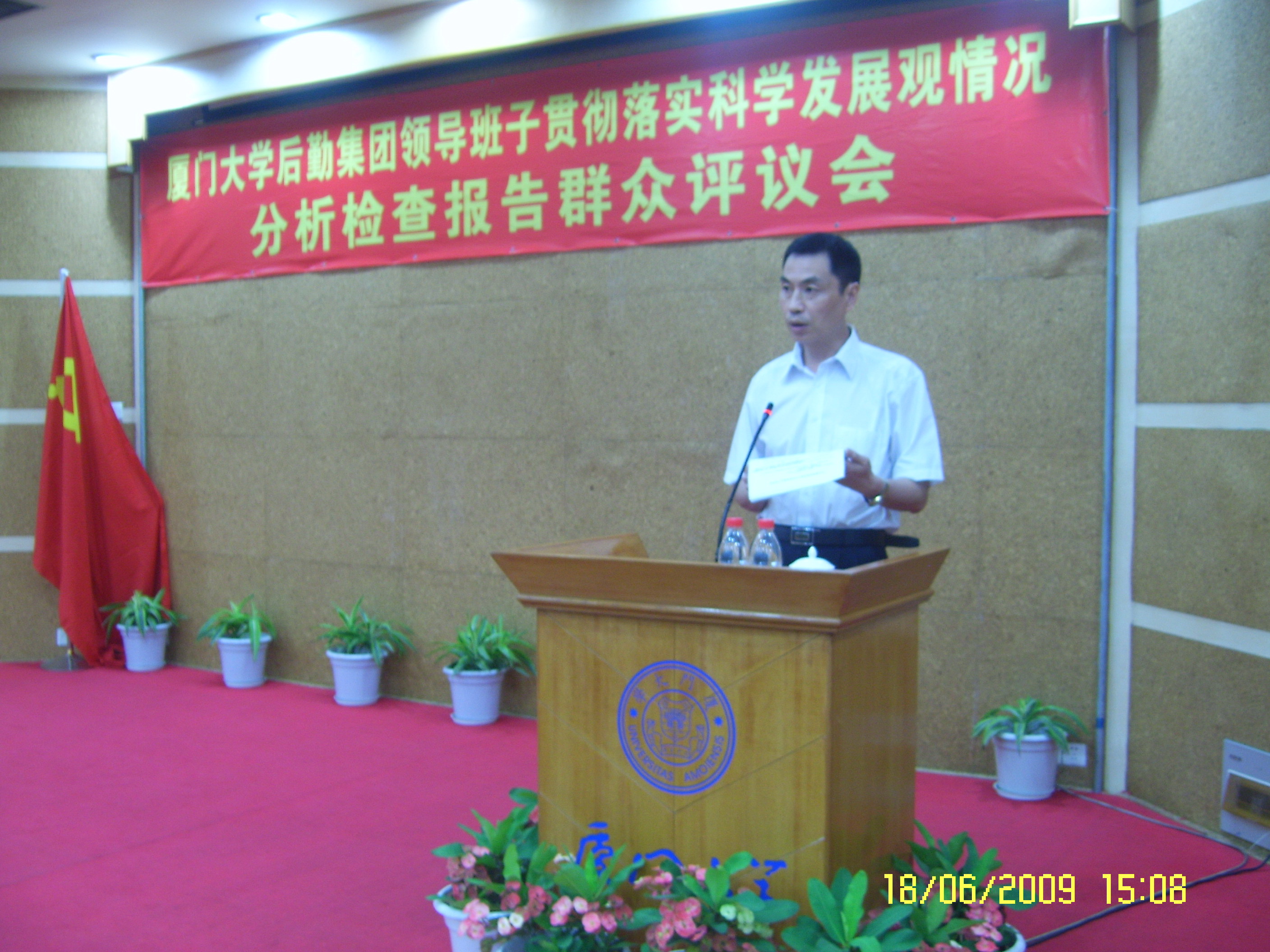 会上,后勤集团党总支书记、集团学习实践活动领导小组组长叶鹏飞就《厦门大学后勤集团领导班子贯彻落实科学发展观情况分析检查报告》的形成过程和主要内容做了介绍。叶鹏飞指出,集团领导班子高度重视《分析检查报告》的起草工作,全程参与其中,并通过召开各级员工座谈会和支部会议,广泛征求意见和建议,最终形成了《分析检查报告》群众评议稿。在简要介绍了《分析检查报告》的整体构架和内容后,叶鹏飞说,《分析检查报告》充分体现了后勤集团领导班子通过学习实践活动对科学发展观的科学内涵、精神实质和根本要求在思想认识上的升华,对中央、教育部和学校关于深入贯彻落实科学发展观部署要求的准确把握,对集团成立以来在贯彻落实科学发展观实践过程的全面审视,以及对推动集团新一轮科学发展的深入思考;充分体现了集团领导班子正视差距和不足,不回避矛盾和问题,敢于突破障碍,树立了战胜困难的信心和勇气。