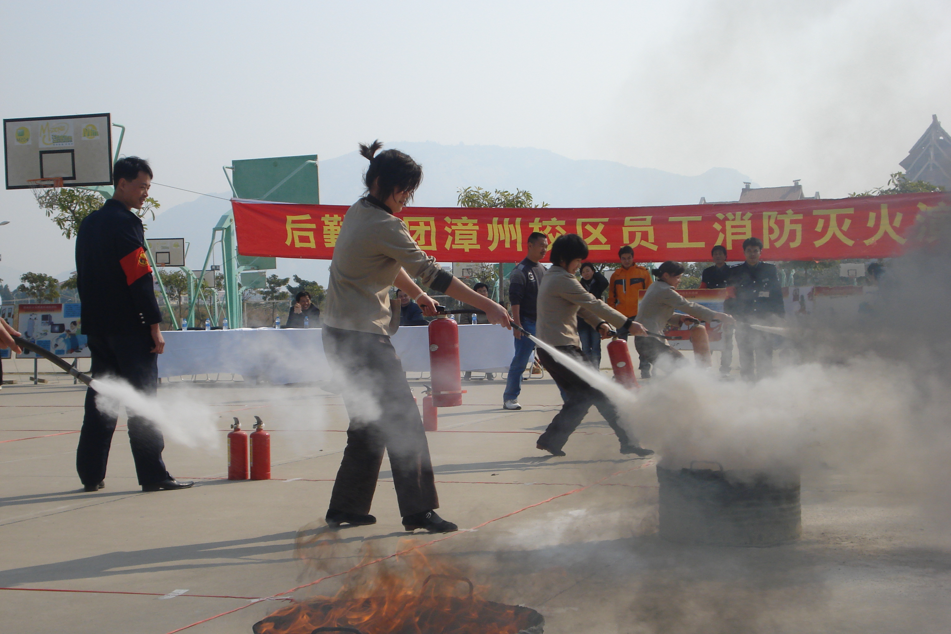 1 月 15日 下午,漳州校区篮球场燃起了熊熊火焰,浓烟滚滚,人们提着灭火器奔跑忙碌,一幅“火情危机”的紧急场面,但仔细一看,“火灾”现场秩序井然,在专业人员示范灭火器操作要领之后,在统一的指挥下,火盆一个个点起,参训的员工轮流上阵灭火,这是后勤集团漳州校区服务办组织各部门进行的一次消防灭火实战演练。