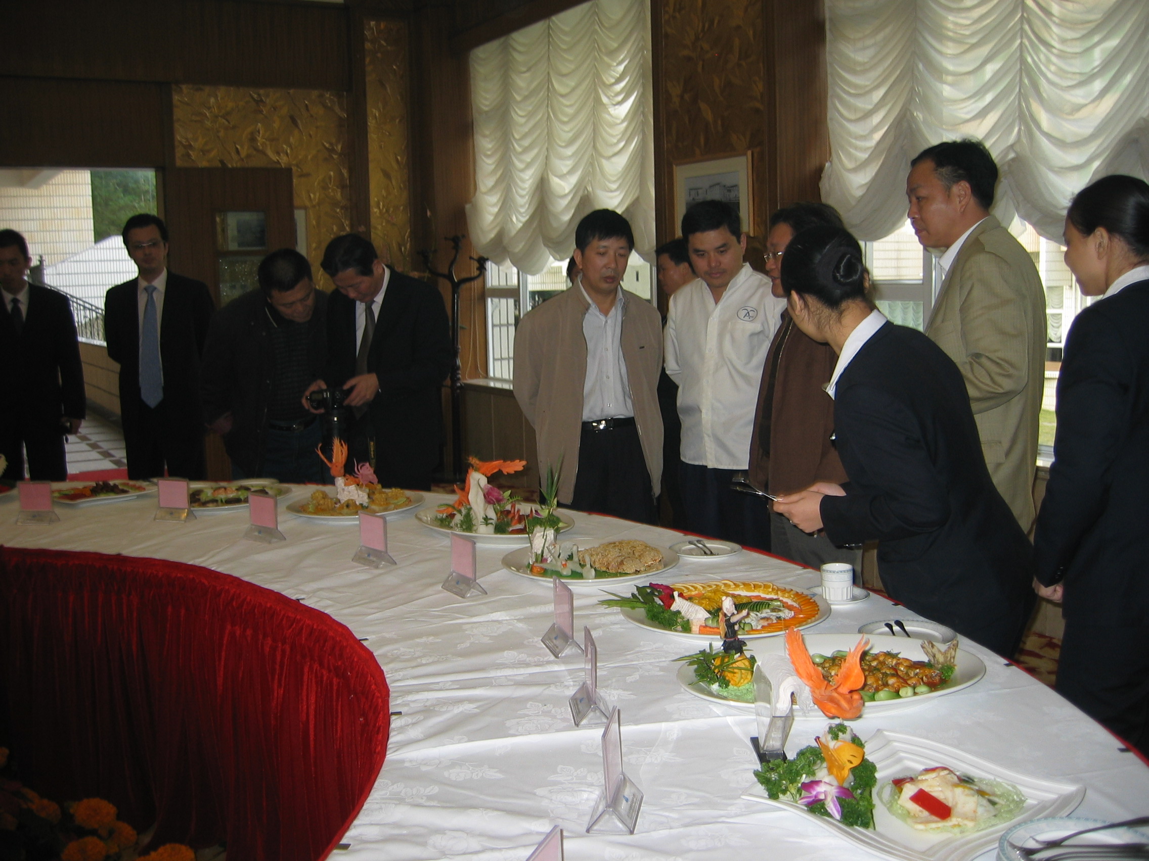 本次大赛系接待中心“服务技术标兵竞赛”系列赛事之一,也是集团开展“优质服务月”的系列活动之一。今年菜肴作品以“龙腾2008”为主题,共有31位厨师设计制作了31道菜肴进行比赛。菜肴集色艳、香浓、味鲜、形美于一身,名称形象生动、寓意深远,如:“吉祥蝴蝶”、“孔雀开屏”、“花枝招展”“丹凤朝阳”、“满园春色”等等,每道菜造型别致、五彩缤纷不雅于一幅幅艺术作品,让现场的观众赞不绝口。