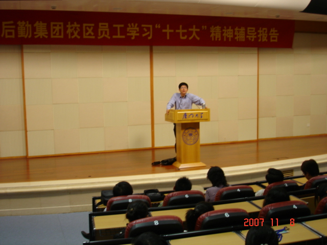 11月8日晚7点30分,后勤集团漳州校区服务办全体员工在漳州校区嘉三主楼小报告厅举行十七大精神学习报告会。受集团党总支书记邱七星的委托,党总支副书记庄惠美专程参加此次报告会,服务办各部门负责人、全体党员及各部门员工共300多人认真聆听了公共事务管理学院徐进功教授所作的十七大精神辅导报告。服务办主任林三阳主持此次报告会。