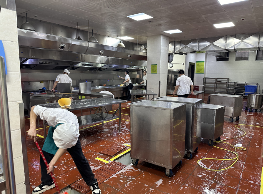 2D:清扫到位,对厨房各功能区进行卫生责任界定,开展卫生打扫,做到餐餐打扫、随时打扫,水沟无积垢,下水道畅通,地面、墙面、窗台、天花板等无水渍、无油渍、无死角。