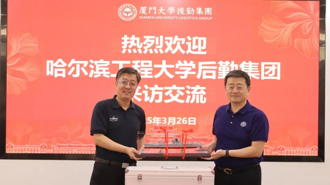 随后,哈工程后勤集团将福建舰模型赠予厦大后勤集团,寓意双方友谊如舰船破浪前行,期望两校后勤携手同行,共赴发展新航程。