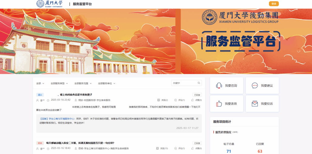 无论是咨询、建议、表扬或是投诉,只要是对厦大校园生活的所思所想,都可以在服务监管平台上发表。通过大家的监督和提议,我们能更好地了解师生的想法,为师生提供更优质的服务。