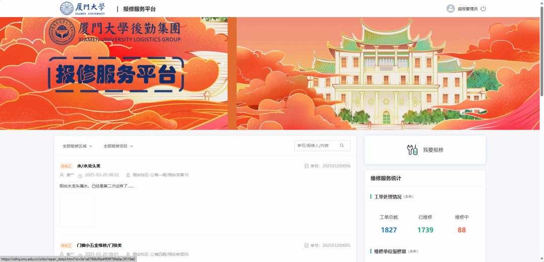 在凤凰花开的学府画卷里,偶有设备设施的“小插曲”轻扰弦歌,作为厦大后勤人,秉持着“一切为了师生”的初心使命,我们以诚挚服务师生的匠心搭建起“智慧后勤”服务体系。