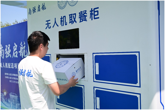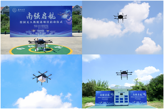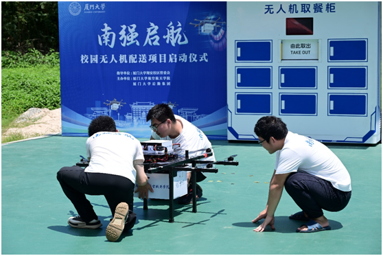 5月15日,厦门大学翔安校区举行"南强启航"校园无人机配送项目启动仪式。一架执行配送首飞任务的无人机满载美食,从厦门大学翔安校区俊海浩韵学生广场腾空而起,沿着预定航线平稳飞行,精准降落到目的地航空航天学院大楼后院的食物接收柜,用户扫码、取餐柜自动出餐,配送任务仅用时3分钟。