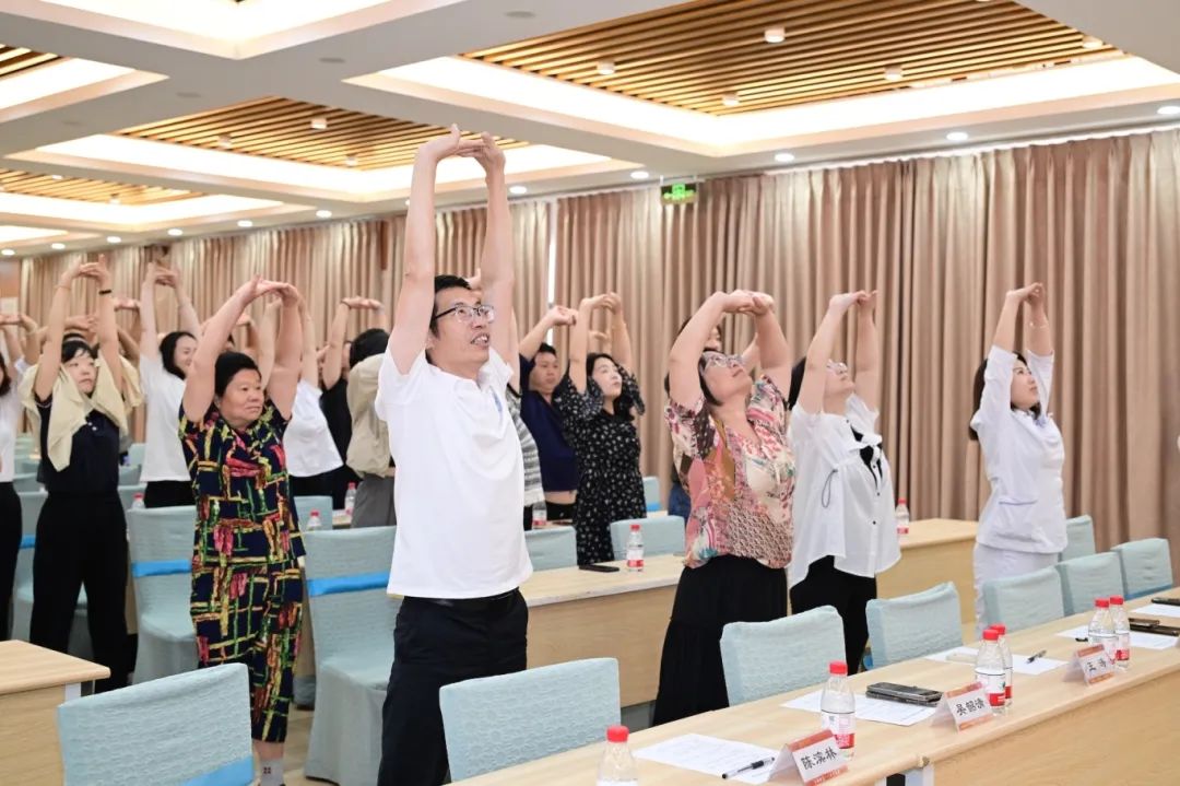 现场康复理疗师聚焦运动减重,向大家介绍了八段锦的起源、动作特点、益处等。通过动图演示的方式展示八段锦的招式,并讲解不同招式对应作用。活动现场大家对照视频体验八段锦跟练。