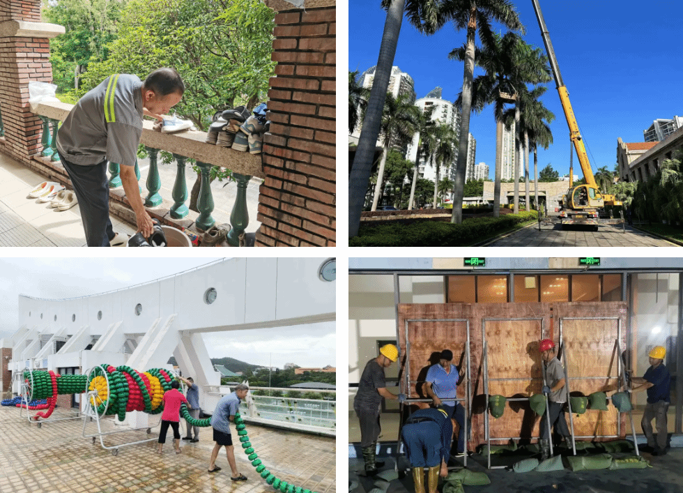 应急抢险人员实行24小时值守,密切关注台风路径、风力及降雨情况,及时掌握风情雨况变化,做好险情预警与处置准备。针对校园易进水区域,安装抗台挡风板,用沙袋封堵地下室、车库等部位,加固松动门窗,检修建筑防风防雨设施。全面清扫排水沟、天台排水口及雨水篦子,清除堵塞物,保障排水畅通,减少校园内涝风险。此外,加固垃圾分类桶,加强运力清运废杂,防止餐厅雨水倒灌,保障校园环境与餐饮安全。