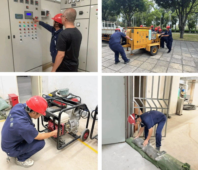 水电工作人员提前做好台风期间保障准备,对发电机、水泵等防台物资设备进行全面测试检修,确保设备正常运行。在田径场发电机房、水泵房门口放置防水沙袋,调配移动发电车至田径场配电室,完成水泵房备用电源电缆调配,构建多重供电保障,避免极端天气下水电供应中断,全力维持校园正常供水供电。