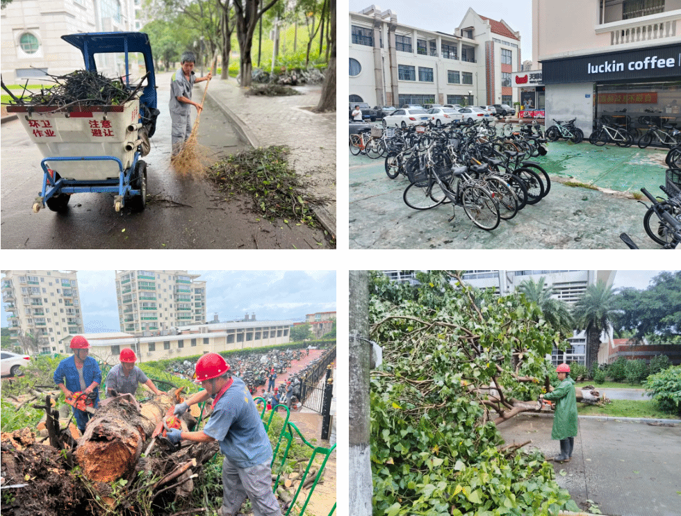 台风过境后,风雨稍歇,后勤集团立即启动校园恢复工作:8月14日凌晨5点多开始,组织人员对设备设施进行安全巡检、隐患清除、对路面进行清扫冲洗,集中清理倒伏树木和路面淤积落叶、杂物,修复受损的设施等,当天下午2点,校园环境快速恢复整洁有序状态,保障师生正常学习生活秩序。本次共清理倒伏树木49棵,包括洋紫荆、南洋楹、榕树等,修复损坏的路灯、玻璃、吊顶、展板、灯座等基础设施44处。