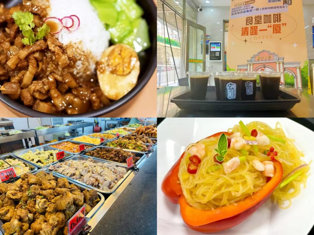 烟火气里藏着最真切的关怀,厦大餐饮早为新生备好“校园第一餐”的惊喜。开学前夕,从食材采购溯源到后厨操作规范,从餐具消毒核验到设施设备检修,每一个环节都经过细致打磨,只为守护舌尖上的安全。各校区餐厅精心定制“迎新菜单”,勤业餐厅的煲仔饭炖罐套餐可随心搭配,酸菜牛肉面里牛腩软烂、酸辣开胃;海韵学生公寓第一餐厅将闽南卤肉饭的古早味与泰式海鲜粉丝彩椒碗的潮流风味上新,让不同地域的新生都能找到熟悉的味道。