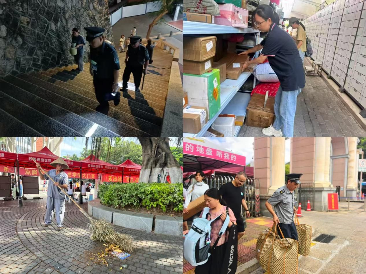 从清早到黄昏,后勤保障服务脚步从未停歇。校园安防人员24小时在岗,引导车辆、疏导人流,筑牢入学第一道防线;宿舍安防员加强园区夜间巡逻,灯光下的身影守护着园区安宁;快递员优化快递处理流程,加速入库流转,助力新生快速取件;保洁员则穿梭在校园人流密集处,巡回清扫、及时清运垃圾,用整洁的环境为新生留下厦园的美好初印象。遇到拖着沉重行李的学子,工作人员总会主动上前帮忙,用双手传递温暖……