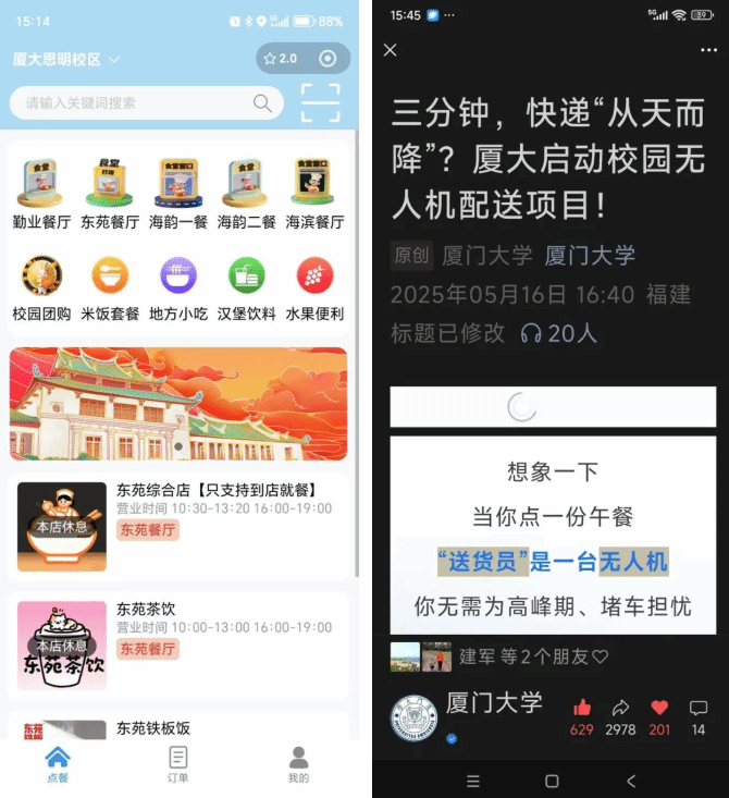 订餐省时间:“厦园食光”订餐平台覆盖两大校区,传统节日还能订伴手礼;翔安校区的无人机配餐更绝,从思源餐厅到取餐柜只要3分钟,科研忙到没时间打饭?“空中快递员”帮你搞定!