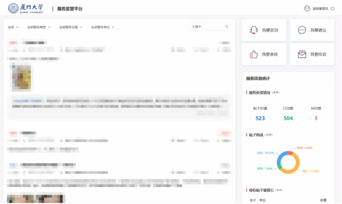 监督“全透明”:服务监督和网上报修集成在“厦大后勤”公众号,不管是“校园生活问题”的咨询、“想表扬保洁阿姨”的肯定,还是“对服务有建议”的反馈,都能在线提交 ——自2018年上线以来,已处理报修约26000次、服务监督约1700次,每一条都有闭环,“句句有回应,事事有着落” 从不落空。