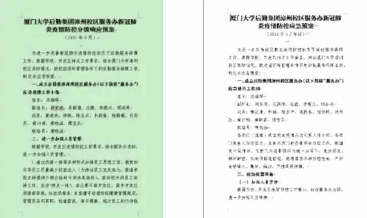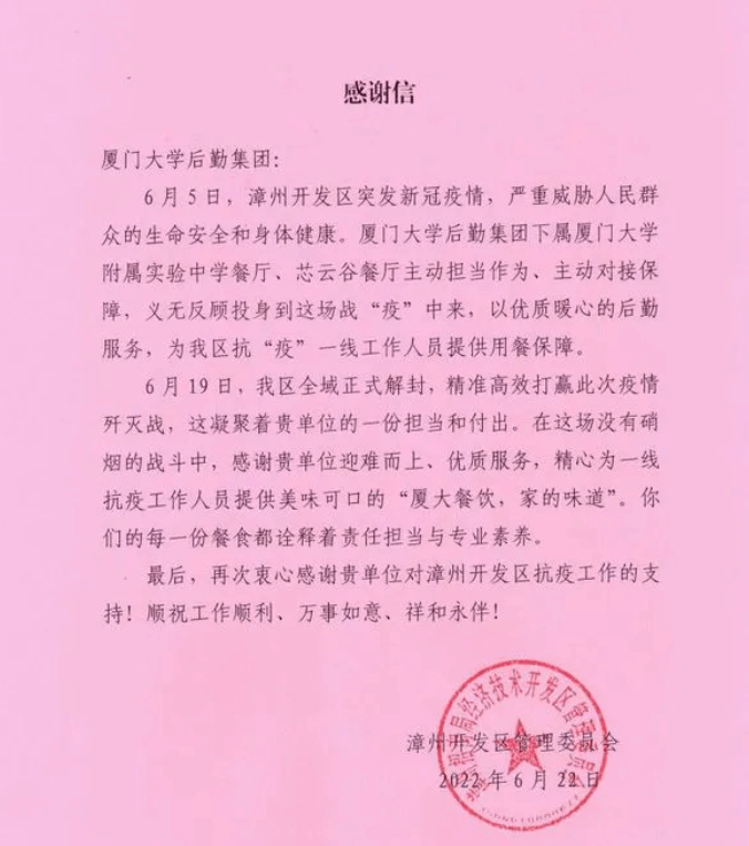 面对复杂严峻的疫情形势,漳州校区服务办以快制快、精准施策,筑牢校园安全屏障。制定《厦门大学后勤集团漳州校区服务办新冠肺炎疫情防控分级响应预案》《厦门大学后勤集团漳州校区服务办新冠肺炎疫情防控应急预案》,精准摸排各部门最低保障人力,为应急处置筑牢制度根基;积极筹措抗疫物资,确保防控一线 “粮草充足”;党员干部与积极分子主动亮身份、当先锋,冲锋在闭环管理、物资配送、核酸保障等关键岗位;全校上下众志成城,不仅守住了校园疫情防线,更主动服务社会——附中餐厅、芯云谷餐厅在繁重校内保障任务之余,为开发区防疫指挥部及核酸检测点、卡口防疫人员配餐约1000 份,以暖心服务赢得开发区管委会的高度认可与感谢信。