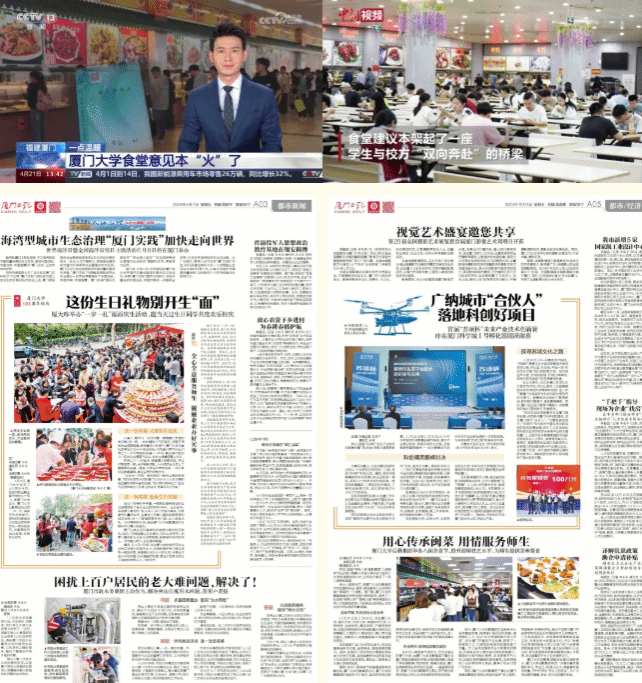 五年来,集团办公室在媒体传播方面取得了显著成效,厦门大学“食堂建议本”分别登上央视“新闻直播间”栏目、新华社、人民日报、中新社等主流媒体平台,“一岁一礼”生日面、八闽美食节、地标美食进校园等活动深受社会与师生好评。后勤集团在人民网、《中国青年报》《福建日报》《厦门日报》等省市级以上媒体累计发布报道73篇,在学校新闻网发布40篇原创稿件,集团网站共发布1565篇文章,“厦大后勤”公众号共发布806篇高质量推文,新增粉丝超1.8万人,发布62条视频号,总浏览量约25万,增强了厦大后勤与师生及公众的互动交流。