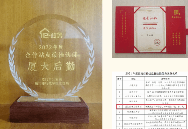 后勤服务大厅的工作成效获得多方认可,其创新案例《便捷服务“一站式”,事半功倍“快、准、优”》于2021年被评为全国教育后勤信息化建设优秀案例,并于2022年刊发于《教育后勤参考》。大厅还荣膺2022年度厦门“e政务”便民服务站最佳伙伴荣誉奖项,成为该奖项设立以来首个获奖的教育系统单位。2024年,服务大厅主管翁永佳同志获评全国教育后勤系统“2023年度最美后勤人”。