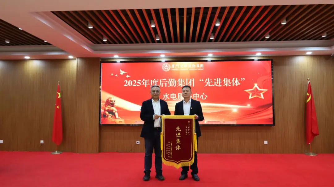 随后,集团副总经理杨建中宣读《关于表彰后勤集团2025年度“先进集体”“先进个人”的决定》。在欢快的乐曲和热烈的掌声中,与会领导为获奖集体和个人逐一进行颁奖。先进集体代表运输服务中心翔安校区运输服务部张小铁、先进个人代表质量监督管理部彭潘一凡依次发表了获奖感言。