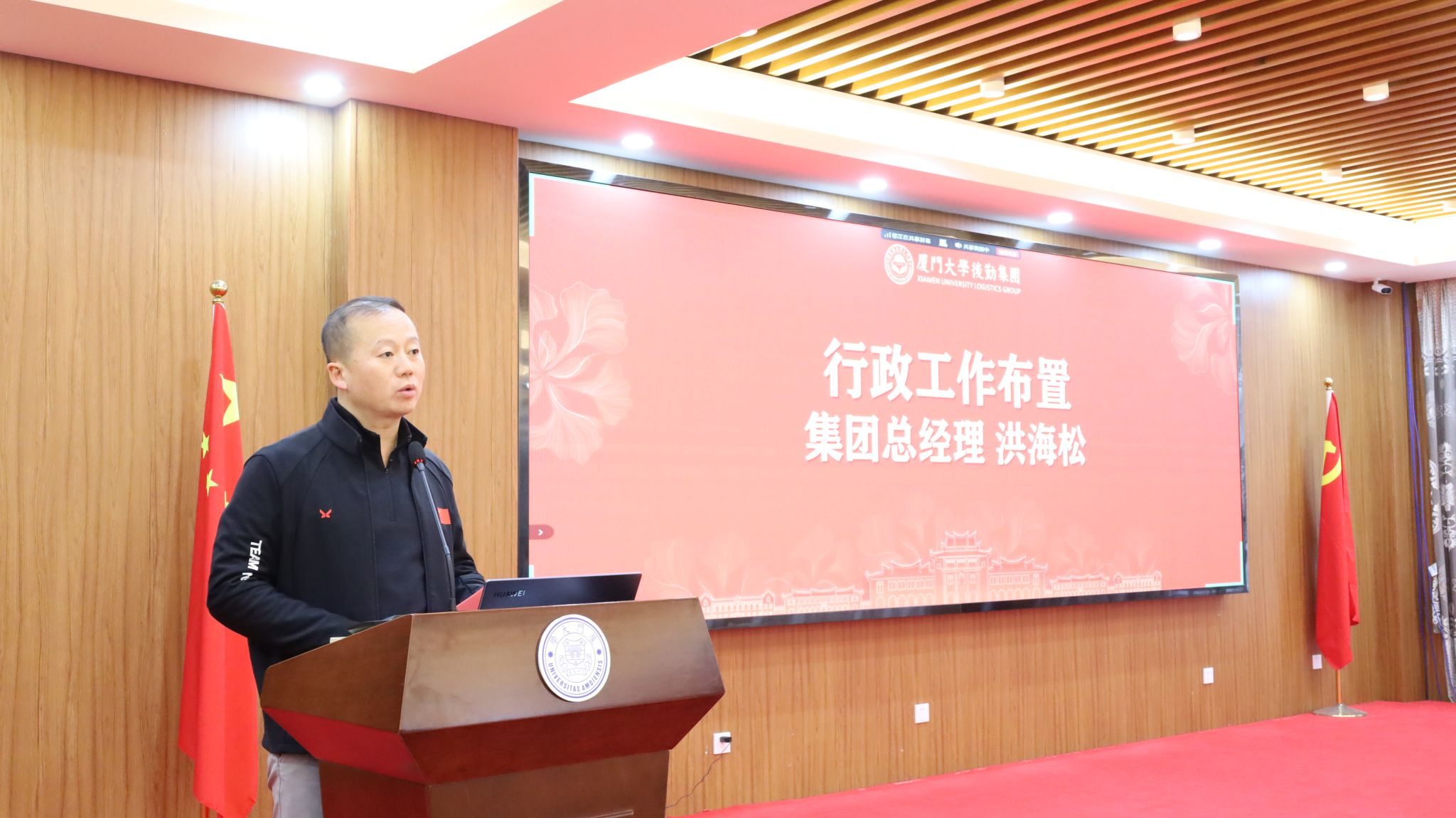 集团总经理洪海松结合近期工作调研情况作行政工作布置。他对集团近年来取得的成效表示肯定,并指出,后勤工作要紧紧围绕国家战略布局和学校中心工作,强化服务意识和育人担当。他从“聚焦重点、攻克难点、打造亮点”三方面提出具体要求:要攻克队伍老化、成本控制、资源集约、信息壁垒和内控执行等发展瓶颈,强化信息化建设,推动“后勤+思政”育人品牌建设,创新餐饮服务模式,加强后勤文化建设,服务乡村振兴战略,拓展思路服务总校与马来西亚分校双向赋能。他强调,全体后勤人要凝心聚力、真抓实干,奋力实现“十五五”良好开局。