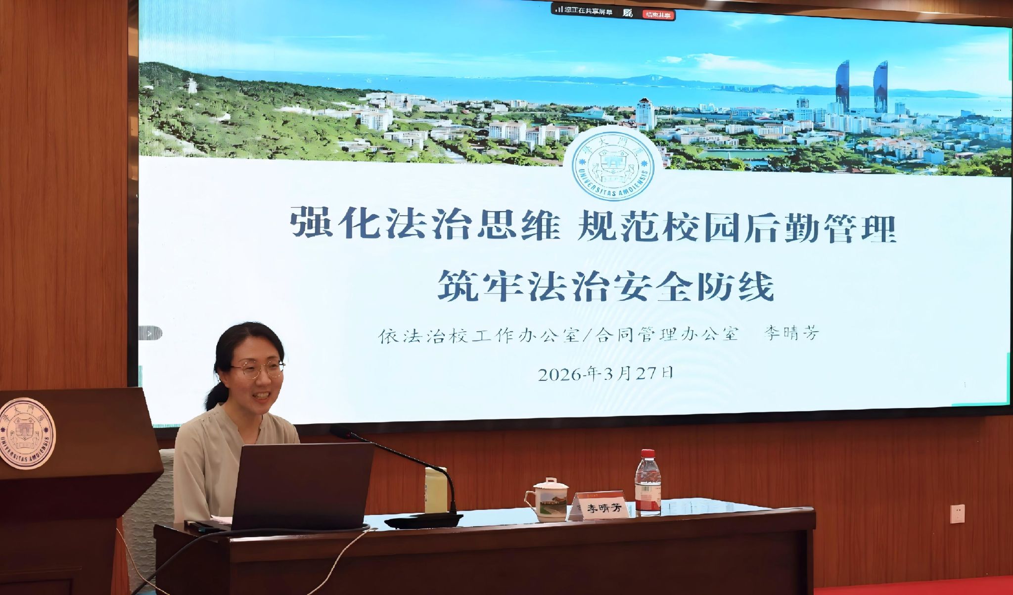 本次会议特别邀请了厦门大学依法治校工作办公室、合同管理办公室主任兼学校办公室副主任李晴芳为大家作法治专题讲座。她立足后勤工作实际,围绕校园安全与合同管理两大重点,结合相关法律案例进行深入讲解,使与会人员深刻认识到法治建设在后勤管理中的重要作用。针对上述两类情形,她还提出了相应的防范措施,帮助大家在必要时有效维护自身权益,降低潜在风险,及时化解危机。她指出,依法治校是一项长期性工作,应通过强化建章立制、构建长效机制、建立风险清单、实施“全生命周期”风险管理、制定应急预案、注重证据留存等举措,切实筑牢校园安全防线。同时,要着力构建合同风险防火墙,严把入口关、履约关、档案关。