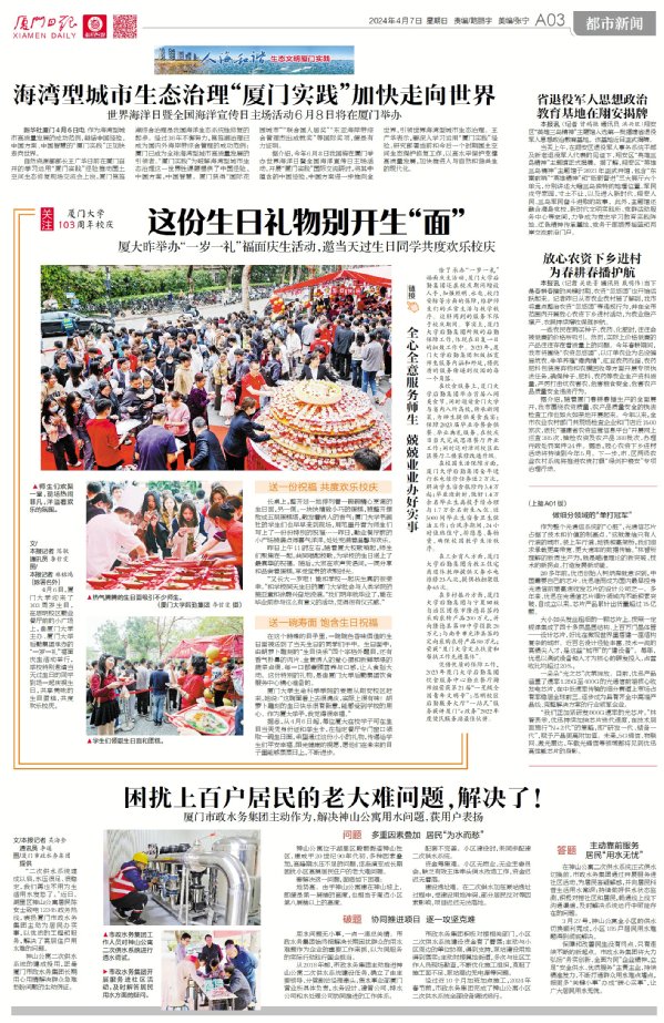 在三全育人方面,厦门大学后勤集团为教工住宅离退休教师提供义务水电维修23人次,提供抬担架服务65次。