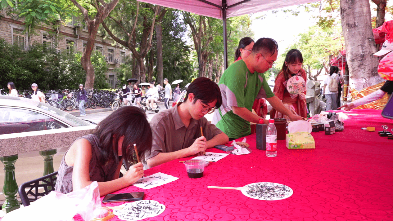 博饼的热闹还在继续,传统文化体验区的雅趣又引人驻足。百把漆扇由工作人员现场晕染制作,扇面图案随机,似藏着不期而遇的惊喜。厦大书画社的同学待漆扇风干后挥毫题字,“花好月圆”的雅致、“中秋快乐”的温馨、“状元及第”的吉祥,墨宝与扇面图案相映成趣,每一把都是独一无二的“中秋限定记忆”,被师生们小心翼翼捧在手中,视作节日里最珍贵的礼物。