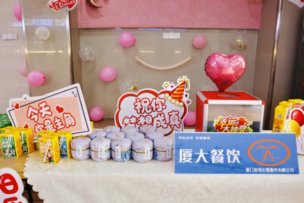 厦大餐饮人精心布置活动现场,有打卡拍照墙、“幽兰表心愿”许愿贴画,还准备了各式各样的礼品,公仔娃娃、牛奶、零食、学习用品……应有尽有。