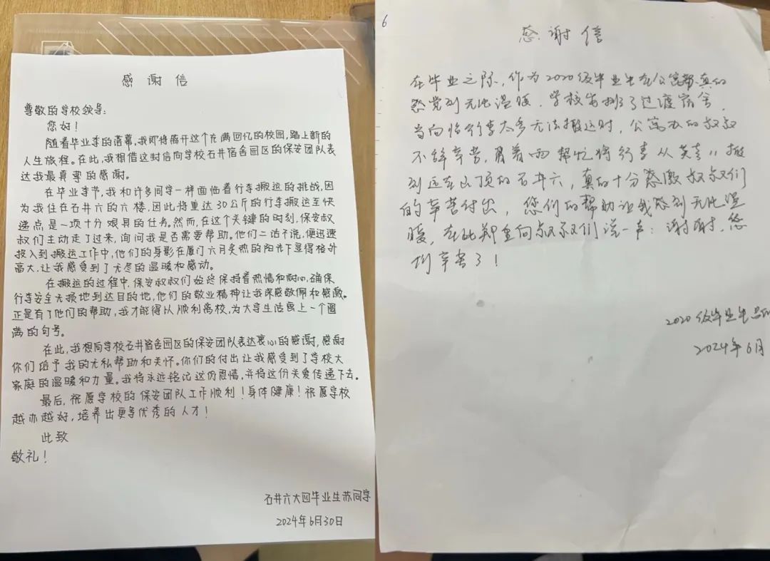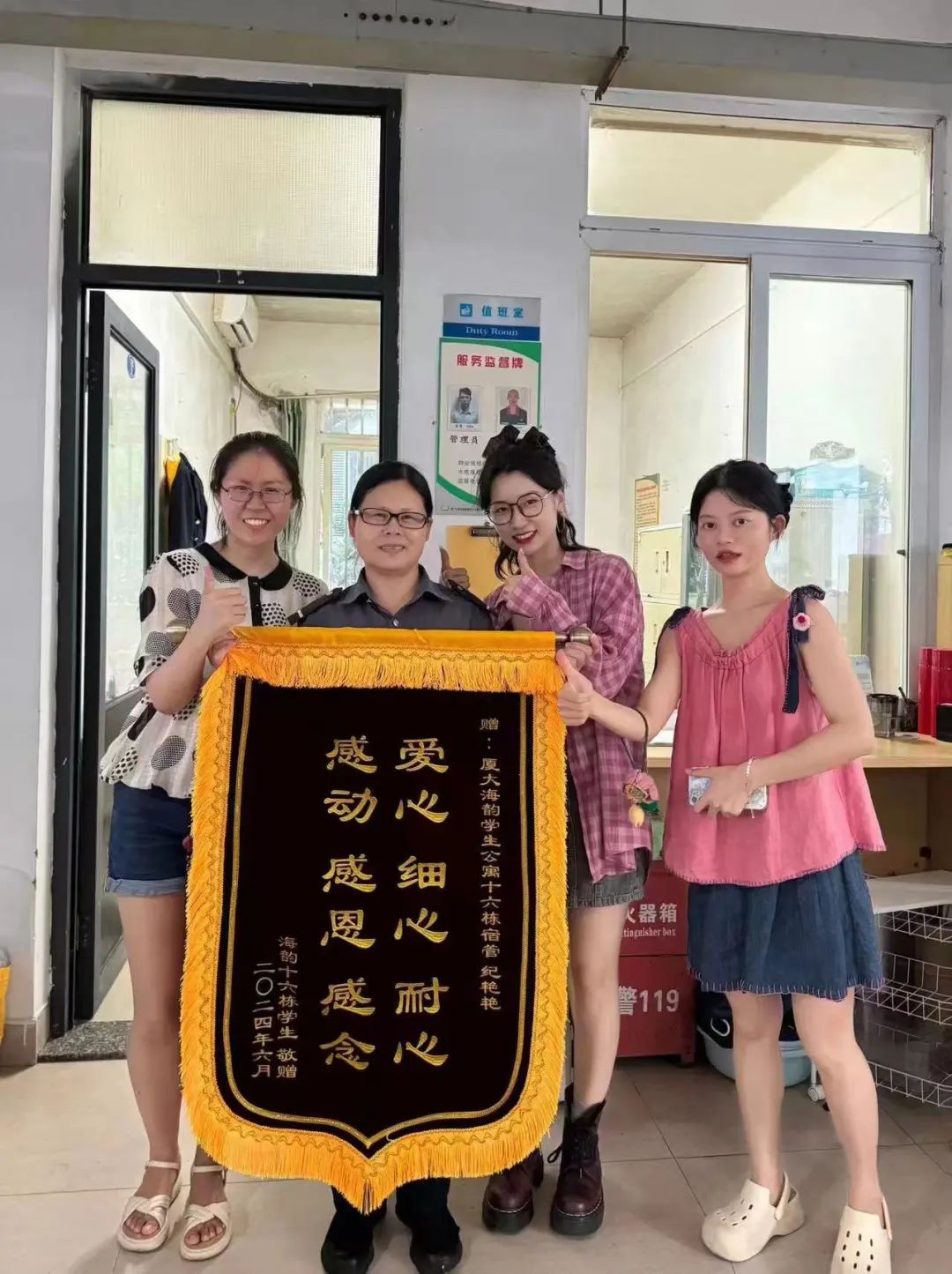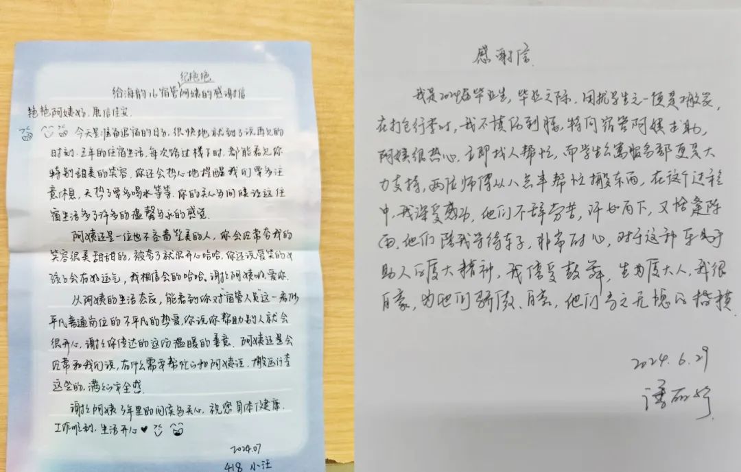 暖心服务化作行,育人润物细无声。四年的相处与陪伴,宿管叔叔阿姨和同学们结下了深厚的感情,毕业生们以温馨的合影、深情的感谢信、祝福的信笺贴等各种方式诉说离别、表达感谢,这些让宿管叔叔阿姨们倍感欣慰和温暖。