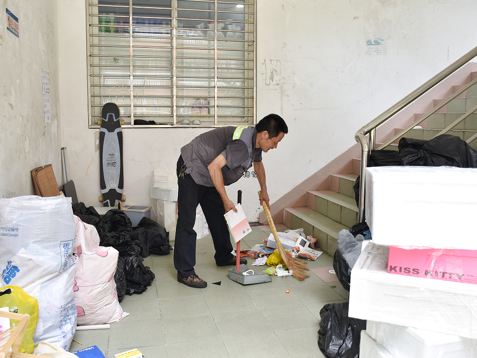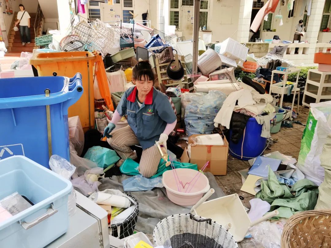 保洁员顶着高温闷热的天气,加班加点清理毕业生宿舍垃圾,为后续宿舍调整、夏令营学生入住、宿舍改造等做好准备。