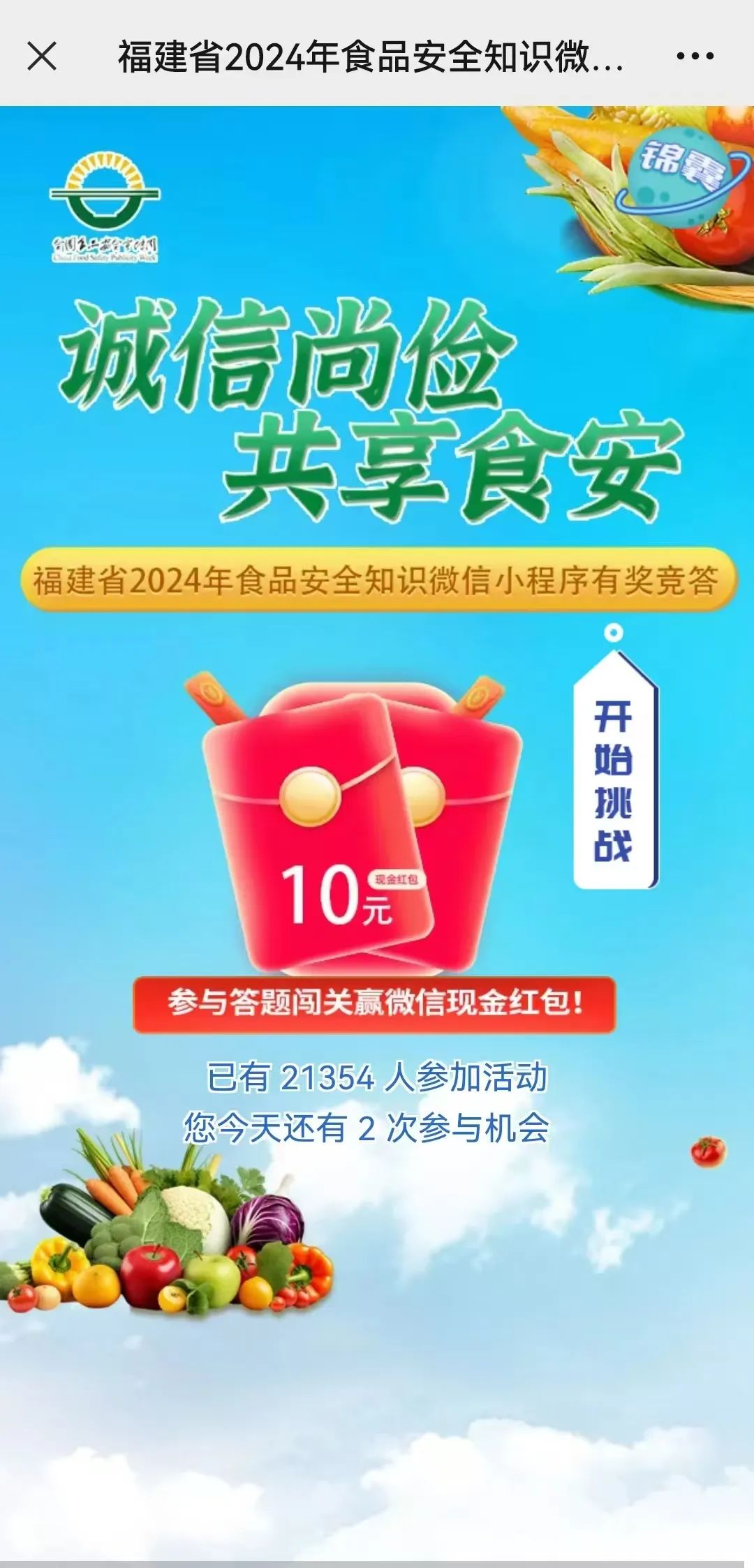 号召员工在东南网微信公众号上参加“福建省2024年食品安全知识网络有奖竞答”,加深对《食品安全法》等法律法规以及食品安全科普常识的理解。通过突出宣传"诚信尚俭 共享食安"的主题,进一步强化了员工的责任意识,树立了正确的食品安全理念。